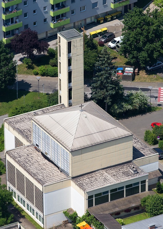 Unweit davon konnte ein Grundstück erworben und 1962 die von Architekt Ferdinand Schuster geplante Kirche mit freistehendem Glockenturm geweiht werden.